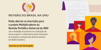 Entre os dias 30 de maio e 26 de junho, a Conectas recebe inscrições para o projeto Multiplicadores da RPU (Revisão Periódica Universal) da ONU. A iniciativa promove em instituições de ensino superior o conhecimento deste mecanismo internacional de avaliação e promoção dos direitos humanos em âmbito brasileiro. Nesta edição, serão selecionados 20 estudantes regularmente matriculados(as) […]
