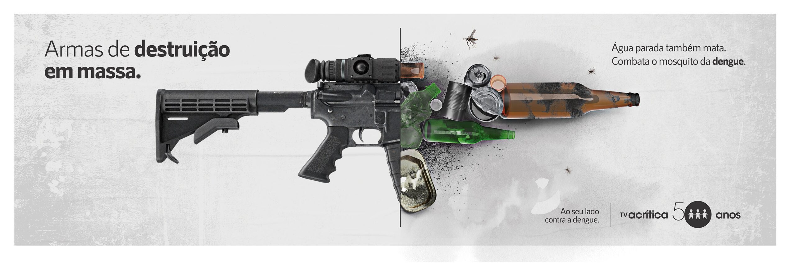 Na categoria Meios De Comunicação, a Mene e Portella também foi premiada com a prata em “Peça de Mídia Exterior”, com a campanha “Combate À Dengue”, desenvolvida para o Grupo A Crítica. De forma criativa, a agência construiu a mensagem de conscientização ao combate à dengue comparando o grande poder de destruição de armas de guerra e objetos com água parada.