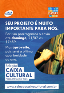 As inscrições para o programa de Seleção Caixa Cultural foram prorrogadas até 21 de Junho (Domingo), às 17h59, exclusivamente via internet, por meio do preenchimento completo do formulário eletrônico disponível no site da Seleção, onde também consta o regulamento.