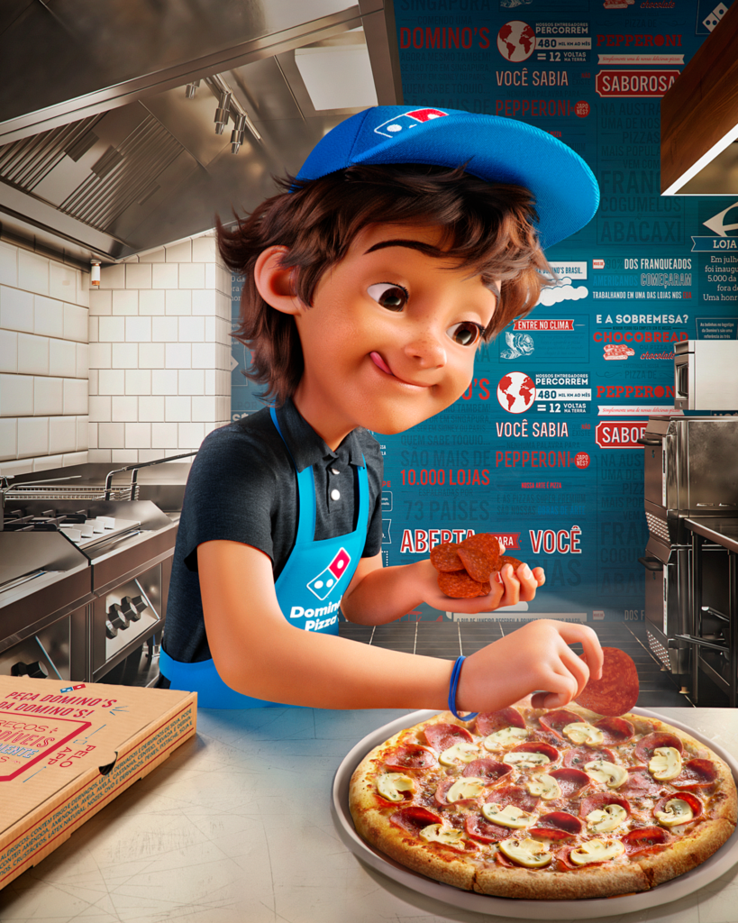 A Domino’s Pizza Brasil convidou o CB, brand persona da Casas Bahia, para experimentar a modalidade Monte Sua Pizza da rede, em que o cliente pode montar a sua pizza, de massa fina ou tradicional, com queijo e orégano, adicionando dois ingredientes. Os sabores escolhidos pelo influenciador virtual foram dois dos favoritos do público brasileiro: Pepperoni e Champignon.
