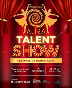 Nos dias 12 e 13 de Julho, a “Escola de Ballet Aura” promove o Festival Aura Talent Show, no Teatro Municipal de Boa Vista (RR). Serão quatro sessões, sendo uma na sexta às 19h30 e três no sábado às 15h, 19h30 e 20h. Os ingressos podem ser adquiridos através da Bilheteria Digital.