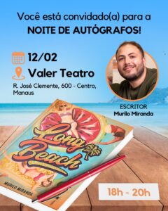 O escritor Murilo Miranda promoverá nesta quarta-feira (12), uma noite de autógrafos do romance “Long Beach”, lançado no final de 2024 pela Editora Viseu. O evento ocorrerá das 18h às 20h, na Valer Teatro, localizada na Rua José Clemente, 600, no centro de Manaus.