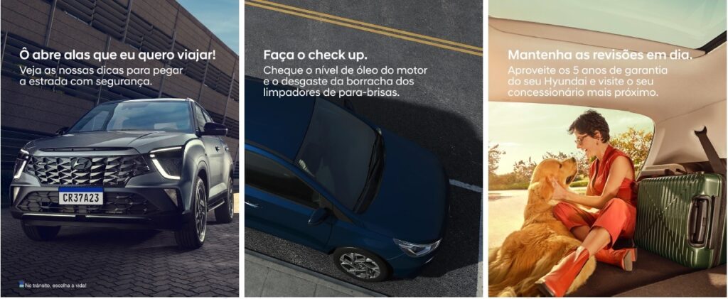 A Hyundai iniciou nesta semana, em suas redes sociais, a campanha digital com postagens que visam alertar os motoristas para pontos de atenção no veículo antes de pegar a estrada, às vésperas do feriadão de Carnaval. Sob a hashtag #DicasHyundai, estão sendo compartilhados alguns itens básicos a serem conferidos pelo condutor do veículo antes de iniciar a viagem, como, por exemplo, o nível de óleo do motor, o desgaste das borrachas do limpador de para-brisa e as lâmpadas, entre outros.