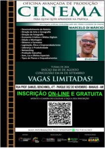 Estão abertas as inscrições para a Oficina Avançada de Produção de Cinema, que será realizada do dia 5 de agosto até 4 de setembro, das 14h às 18h, no Instituto Durango Duarte, localizado no Passeio do Mindu, Zona Centro-Sul de Manaus.