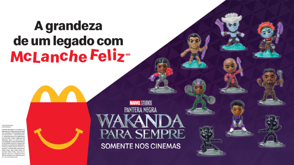 Neste mês, o McLanche Feliz comemora o lançamento da mais nova produção da Marvel Studios, “Pantera Negra: Wakanda para Sempre”. Ao todo, são dez miniaturas inspiradas nos personagens do filme, que já estão disponíveis nos restaurantes do McDonald’s.