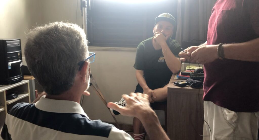 Também falei com quatro ex-alunos dele. Alguns foram seus bolsistas no Cine & Vídeo Tarumã. Depois desses depoimentos, fiz o enredo e acredito que em mais de quatro meses trabalhei na confecção do roteiro.