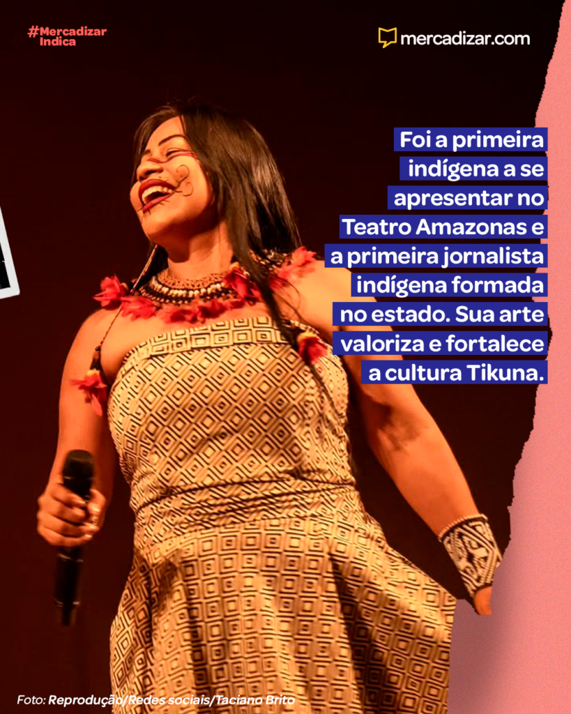 Nascida em Tabatinga, no Amazonas, Djuena Tikuna é cantora, compositora, atriz, jornalista e ativista indígena, reconhecida como uma das maiores referências em música indígena no Brasil. Morou até os oito anos na aldeia Umariaçu II e, em 2006, formou o grupo Magüta com seus irmãos. Sua participação na coletânea “Cantos Indígenas” em 2008, a levou a eventos importantes como a conferência Rio+20 e à abertura das Olimpíadas de 2016, onde apresentou sua versão Tikuna do hino nacional.