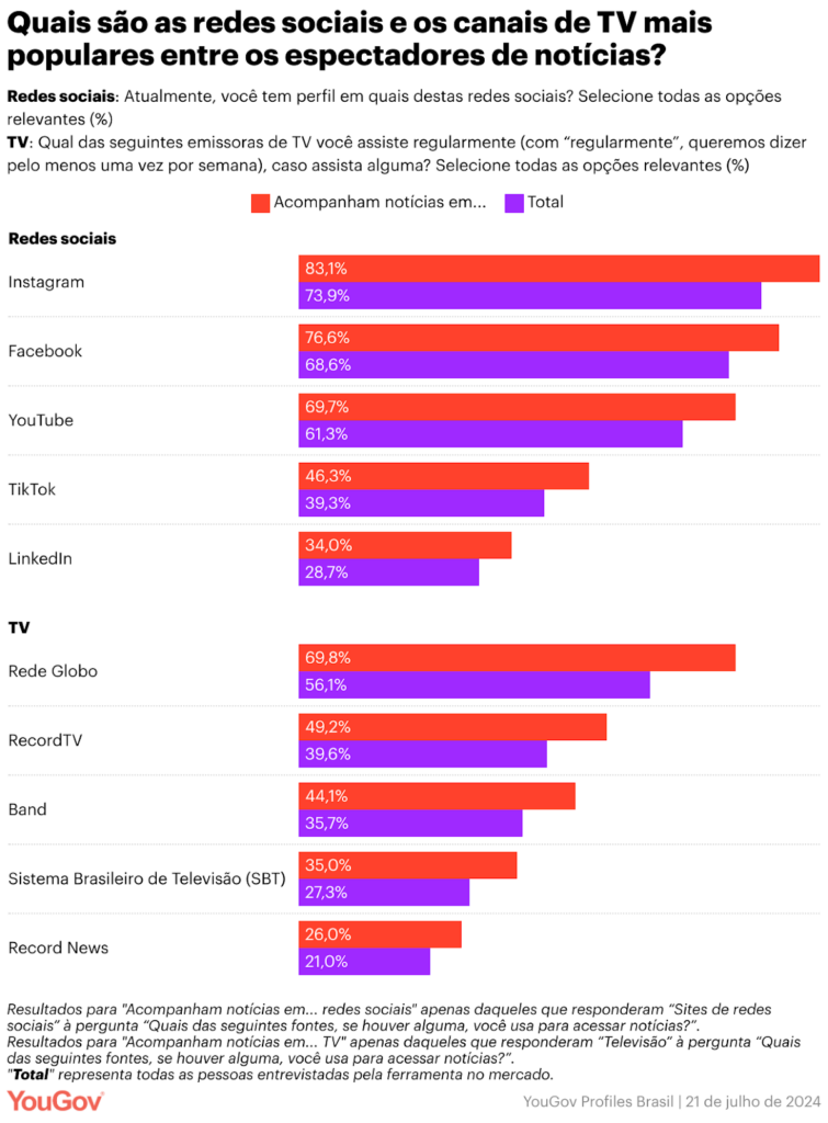 É importante observar que os brasileiros que consomem suas notícias na TV ou nas mídias sociais, em comparação com a população em geral, tendem a preferir essas plataformas com mais frequência. Por exemplo, enquanto 69,8% das pessoas que recebem notícias na TV assistiram à Rede Globo nos últimos 30 dias, o número é menor em nível nacional, 56,1%. Entre os que recebem notícias das redes sociais, 83,1% são membros do Instagram. Entre o público em geral, o número é de 73,9%.