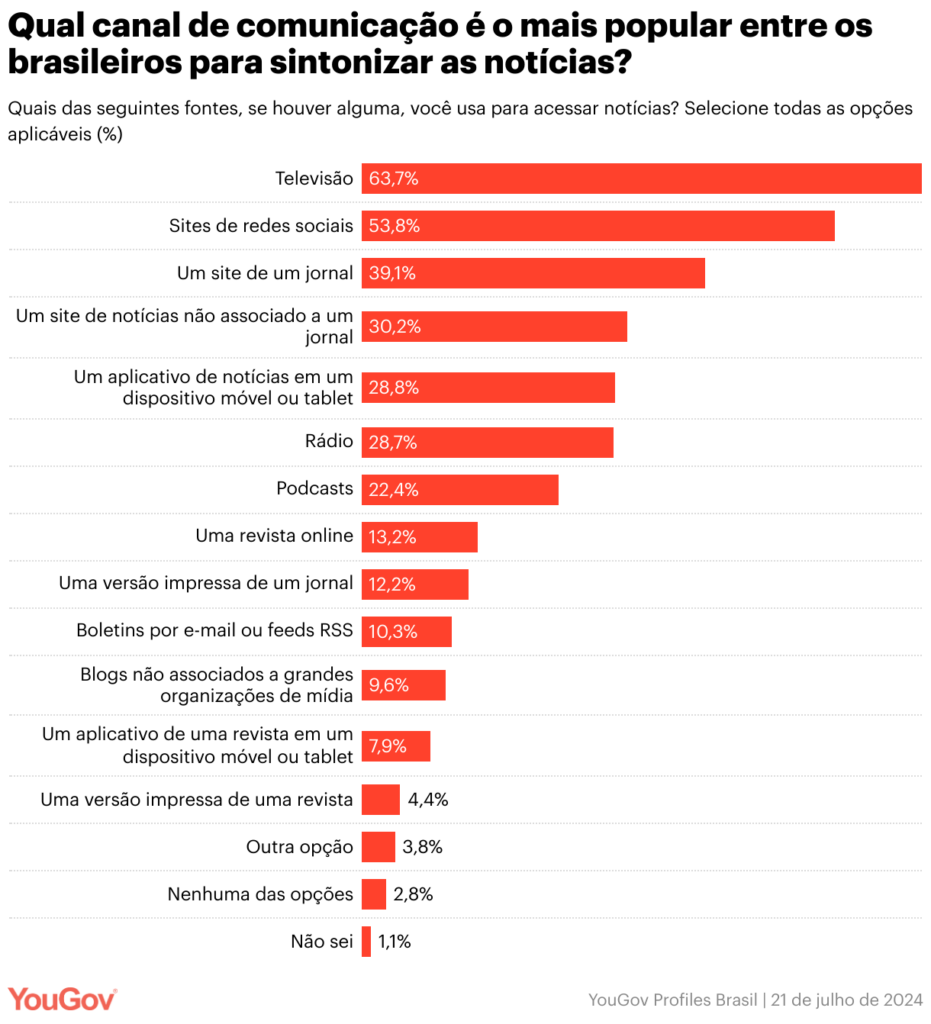 Em plena era digital, a televisão continua sendo a mídia mais popular para consumo de notícias no Brasil, de acordo com a multinacional de pesquisa de mercado on-line, YouGov. Dados da YouGov Profiles mostram que 63,7% disseram ter usado a TV para se informar sobre histórias locais, nacionais e internacionais relevantes. A porcentagem ainda é estatística e substancialmente maior do que a registrada no segundo canal mais popular, as redes sociais, com 53,8%. Essas são as únicas mídias que são usadas regularmente por mais da metade dos adultos entrevistados.