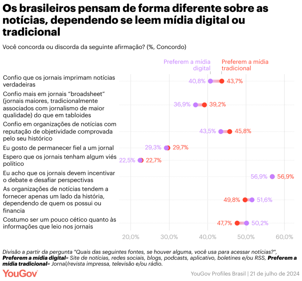 Os dados da Profiles sugerem ainda que os brasileiros têm atitudes e comportamentos diferentes ao consumir notícias, dependendo se as recebem de canais digitais ou da mídia tradicional. Por exemplo, 43,7% das pessoas que consomem notícias pela TV, rádio ou publicações impressas dizem que confiam que os jornais publiquem a verdade. O número é estatisticamente mais baixo, 40,8%, entre aqueles que se informam em sites de notícias, aplicativos, podcasts, redes sociais e similares.