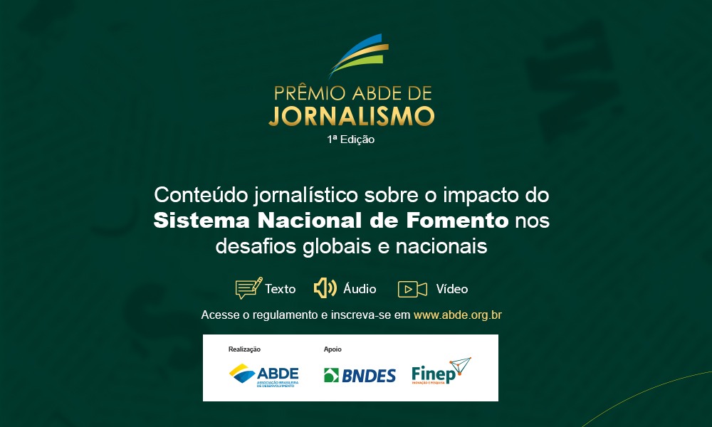 O Prêmio ABDE de Jornalismo, com inscrições abertas até 30 de setembro,exige que candidatos atentem aos critérios que serão analisados. Além da temática central que é “O impacto do Sistema Nacional de Fomento nos desafios globais e nacionais”, é necessário observar os Critérios da Notícia. Os vencedores receberão valores que variam entre R$3 mil e R$17 mil, conforme a categoria inscrita, que inclui matérias em texto, áudio e vídeo.