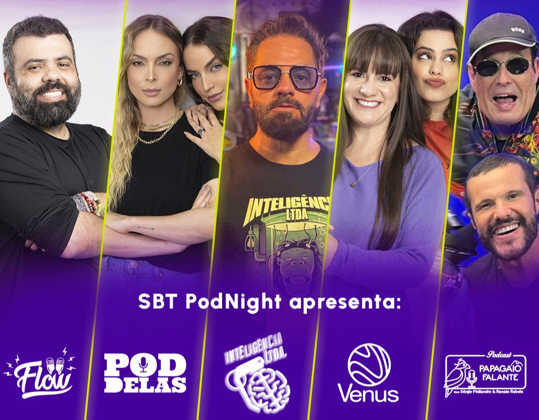 Outra novidade anunciada foi o SBT PodNight, que reunirá diversas atrações, incluindo, “Flow” apresentado por Igor Coelho; “Venus” com Yasmin Yassine e Criss Paiva; “PodDelas” comandado por Tata Estaniecki e Bruna Unzueta; “Podcast Papagaio Falante”, com Sérgio Mallandro e Renato Rabelo e “Inteligência Ltda.” por Rogério Vilela.