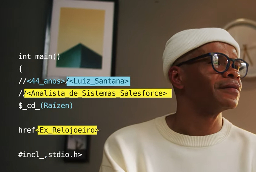 A campanha mostras as histórias reais de Alliny Machado, 22 anos, ex-recepcionista que ingressou na carreira de desenvolvedora na Global Hitss; e de Luiz Santana, que era relojoeiro e, com 44 anos, tornou-se analista de salesforce na Raizen após se formar num curso da SoulCode.