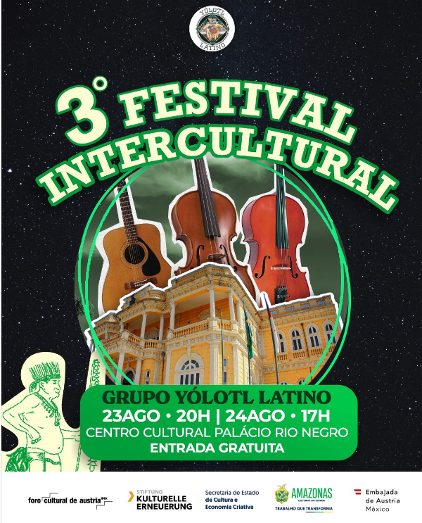 Nos dias 23 e 24 de agosto, Manaus será palco do 3º Festival Intercultural, evento que visa promover a conexão entre profissionais, estudantes de música, comunidades indígenas e interessados em música. Realizado no Centro Cultural Palácio Rio Negro, o evento acontece a partir das 20h no dia 23 e às 17h no dia 24.