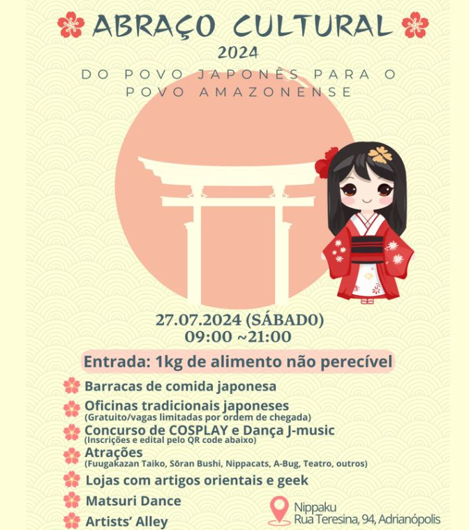 A terceira edição do “Abraço Cultural” ocorre neste sábado (27), das 9h às 21h, na sede da Associação Nipo-Brasileira da Amazônia Ocidental (Nippaku), localizada no bairro Adrianópolis, zona Centro-Sul de Manaus. A entrada é 1kg de alimento não perecível.