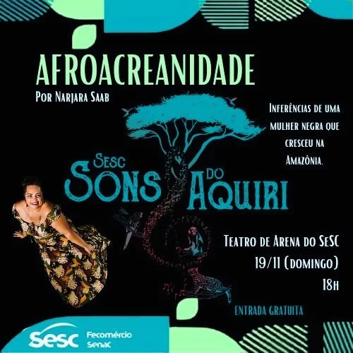 Como parte do projeto Sesc Sons do Aquiri, a cantora Narjara Saab apresentará o espetáculo “Afroacreanidade”, no próximo domingo, 19, no Teatro de Arena do Sesc, em Rio Branco, no Acre. A apresentação é gratuita e tem como protagonista a narrativa da mulher negra, nascida e criada na Amazônia.