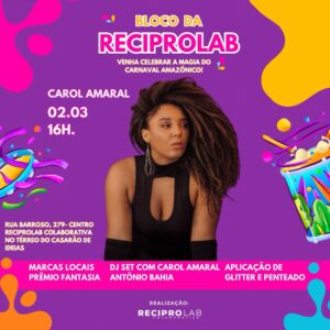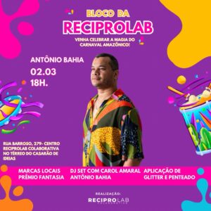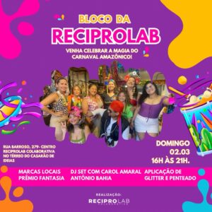 O Bloco da Reciprolab tem como proposta valorizar a cultura amazônica e fortalecer redes colaborativas de arte e economia criativa. A festa acontece na Reciprolab Colaborativa, localizada na Rua Barroso, 279, e é aberta ao público.