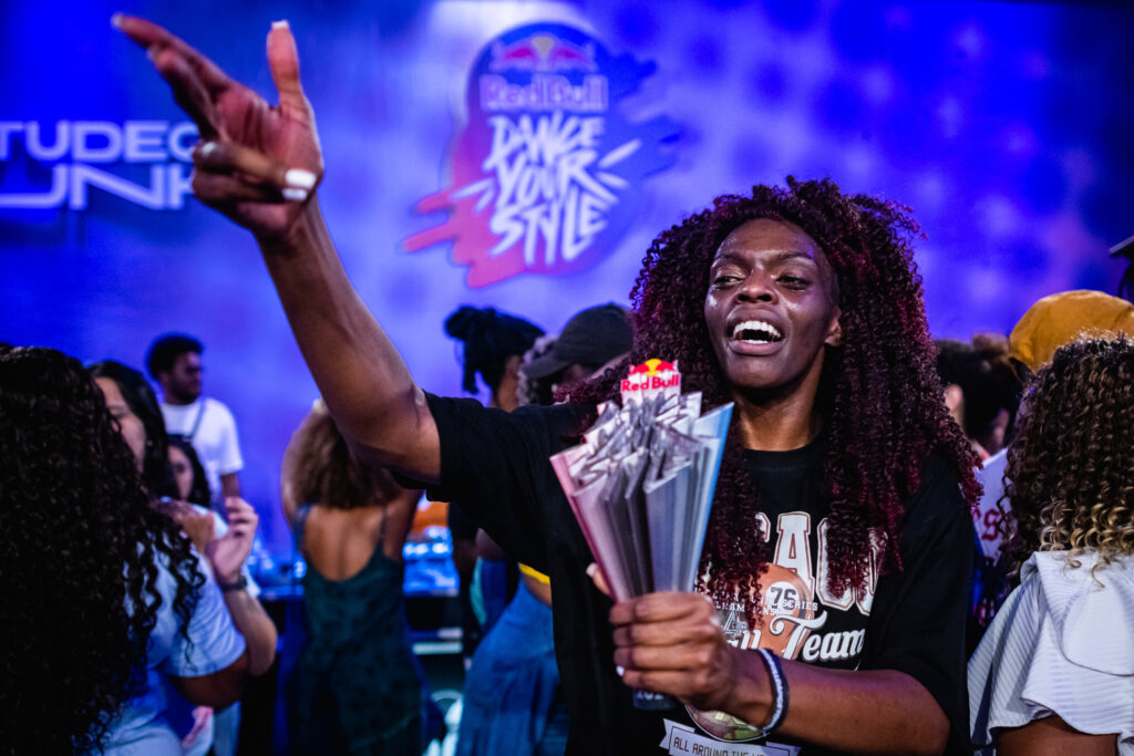 Imagem: Darlita Albino celebrando a vitória no Red Bull Dance Your Style no Rio de Janeiro (Marcelo Maragni)
