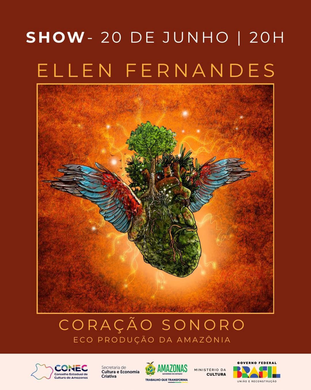 O projeto ‘Coração Sonoro: Uma Ecoprodução da Amazônia’ é uma idealização e realização da cantora e compositora Ellen Fernandes, e conta com apoio da Secretaria de Cultura e Economia Criativa do Amazonas, através da Lei Paulo Gustavo (LPG).