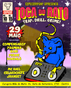Neste domingo, 29, a Cepecompany apresenta o evento Toca do Rato, que começa às 19h30 no Espaço Cultural Curupira Mãe do Mato, localizado na Av. Sete de Setembro, Nº 1710, Centro.