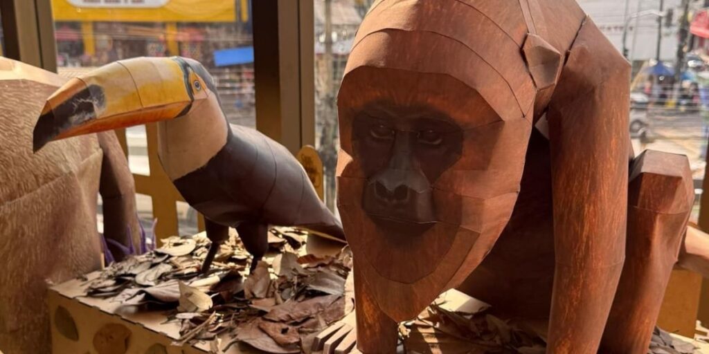 A iniciativa transforma o espaço em um verdadeiro habitat de papel, com animais como onças, araras e macacos, todos elaborados para transmitir a essência da floresta de forma autêntica e poética.
