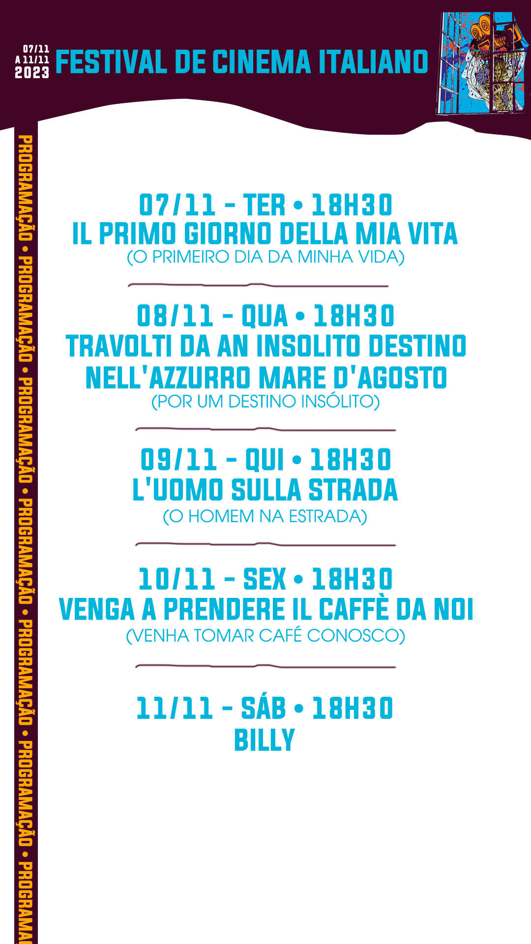 A 18ª edição do Festival de Cinema Italiano no Brasil celebra a cinematografia da Itália, com seleção de filmes inéditos dirigidos por renomados cineastas italianos contemporâneos, com grandes produções e atuações, o festival também apresenta nomes novos na direção e produções independentes.