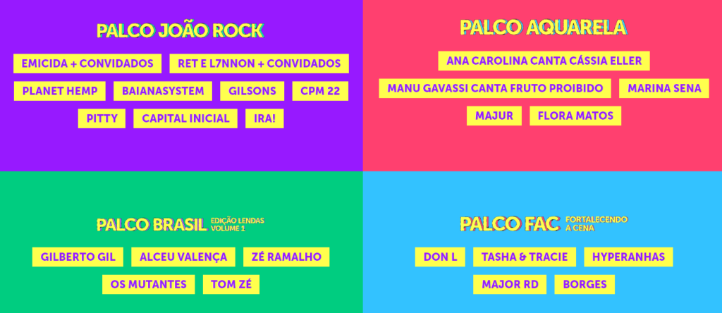Mais de 20 atrações subirão nos quatro palcos do festival, que celebra os seus 20 anos de história. Confira a lista completa de atrações em cada palco: