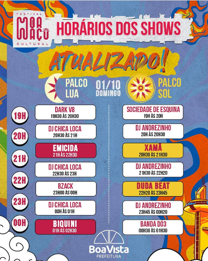 O Festival Mormaço Cultural atualizou os horários dos shows do domingo, dia 1º de outubro. Com as pequenas mudanças, o rapper Emicida passa a subir mais cedo ao Palco Lua, às 21h. Confira os novos horários: