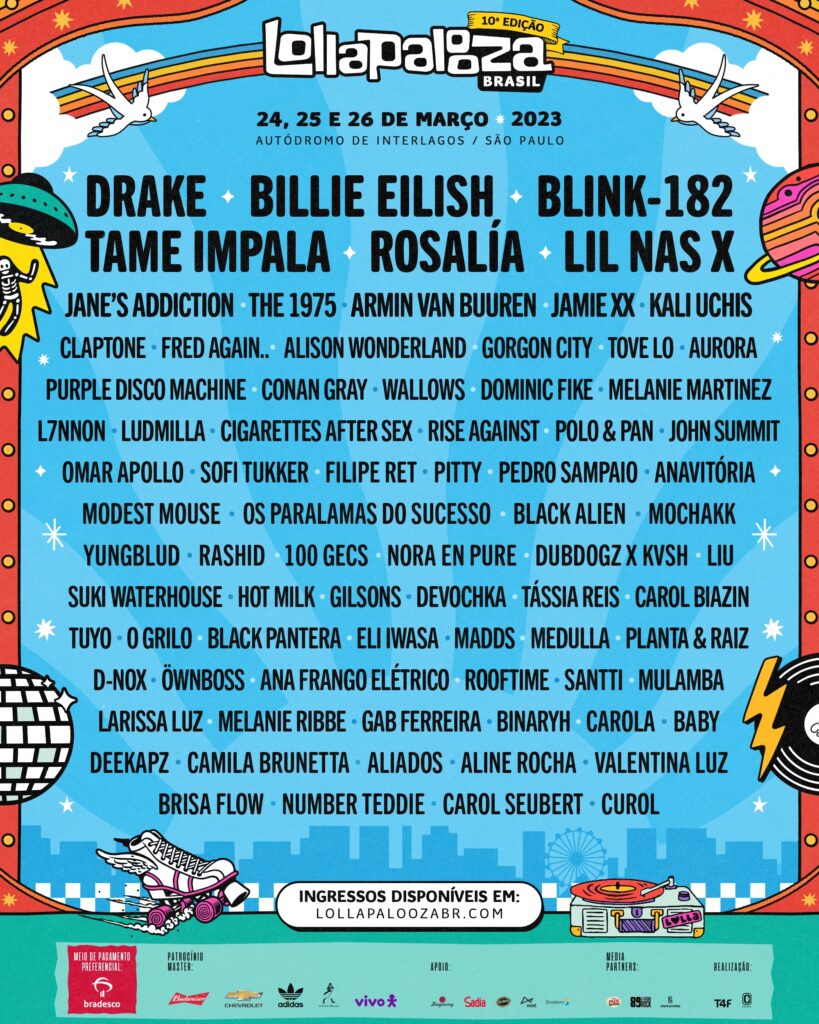 Drake, Billie Eilish, blink-182, Tame Impala, Rosalía, Lil Nas X, Jane’s Addiction, The 1975, Armin van Buuren, Jamie XX, Kali Uchis, Claptone, Fred again.., Alison Wonderland, Gorgon City, Tove Lo, AURORA, Purple Disco Machine, Conan Gray, Wallows, Dominic Fike, Melanie Martinez, L7NNON, LUDMILLA, Cigarettes After Sex, Rise Against, Polo & Pan, John Summit, Omar Apollo, Sofi Tukker, Filipe Ret, Pitty, Pedro Sampaio, ANAVITÓRIA, Modest Mouse, Os Paralamas do Sucesso, Black Alien, Mochakk, YUNGBLUD, Rashid, 100 gecs, Nora En Pure, Dubdogz x KVSH, Liu, Suki Waterhouse, Hot Milk, Gilsons, Devochka, Tássia Reis, Carol Biazin, Tuyo, O Grilo, Black Pantera, Eli Iwasa, Madds, Medulla, Planta & Raiz, D-Nox, Öwnboss, Ana Frango Elétrico, Rooftime, Santti, MULAMBA, Larissa Luz, Melanie Ribbe, Gab Ferreira, Binaryh, Carola, BABY, Deekapz, Camila Brunetta, Aliados, Aline Rocha, Valentina Luz, Brisa Flow, Number Teddie, Carol Seubert, Curol.