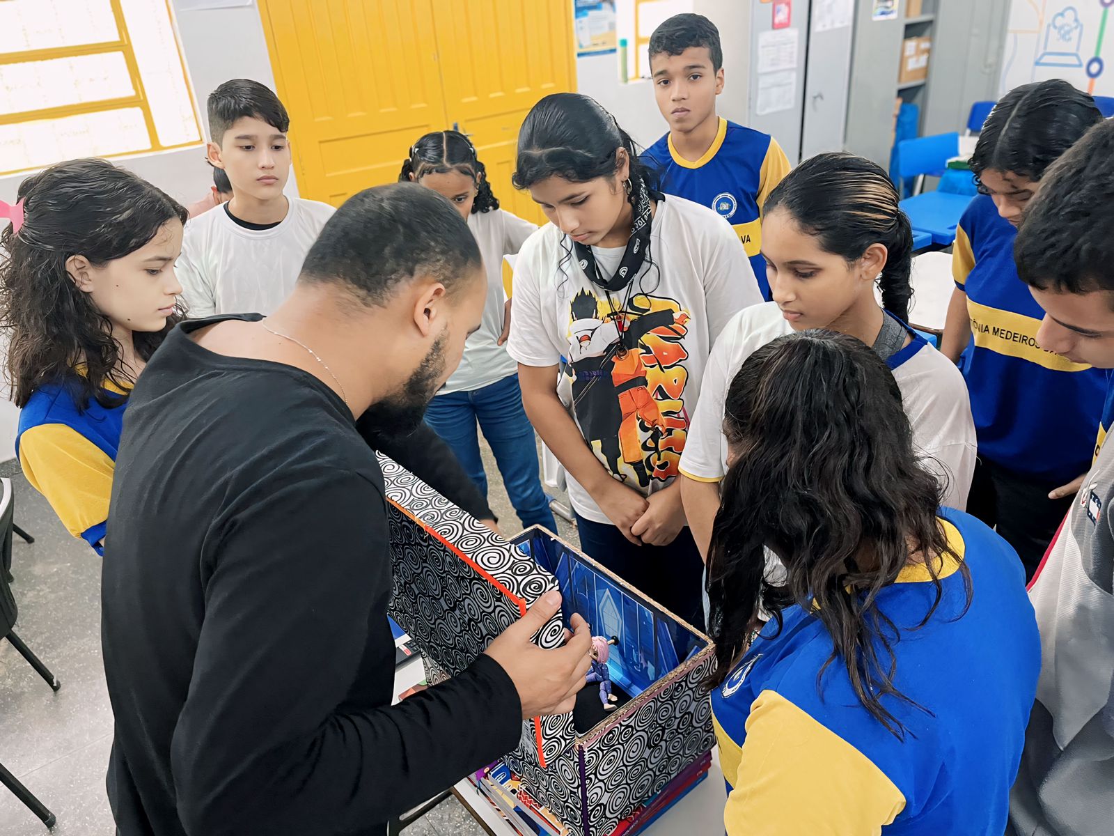 Alunos observam explicação de Cairo sobre o interior da caixa (Divulgação)