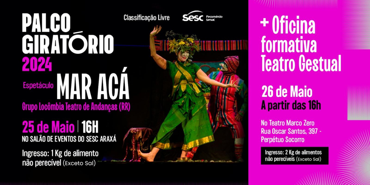 O Palco Giratório, considerado o maior projeto de circulação de artes cênicas do país, levará ao Sesc Amapá a apresentação do espetáculo “Mar Acá”. O evento acontecerá no dia 25 de maio, às 16h, no Salão de Eventos do Sesc Araxá. O ingresso é um quilo de alimento não perecível, exceto sal.