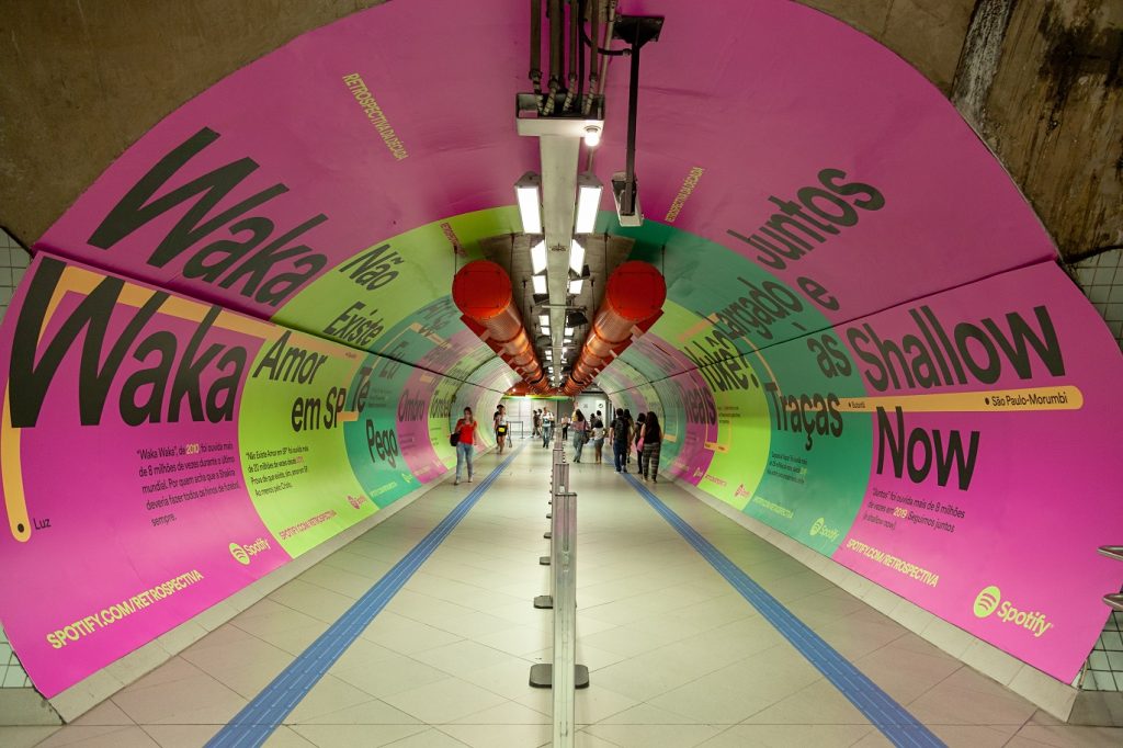 Depois de liberar a retrospectiva 2019 para todos os usuários, o Spotify criou um “túnel do tempo” no metrô de São Paulo para celebrar e relembrar os hits da década. Intitulada “Da Luz ao Morumbi, uma viagem no tempo”, a ação usa as estações da Linha 4 Amarela. Assim, os usuários do transporte coletivo que passarem por lá vão notar que as paredes foram coloridas com trechos icônicos de músicas que fizeram sucesso na década como “Waka Waka”, “Malandramente” e “Envolvimento”.