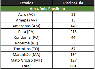 Além dos sete estados da região Norte, a Amazônia Brasileira é composta por outros dois: Mato Grosso e Maranhão. Segundo dados disponibilizados pelo Instituto Trata Brasil, os nove estados somados despejam diariamente quase 900 piscinas olimpíadas de esgoto sem tratamento.