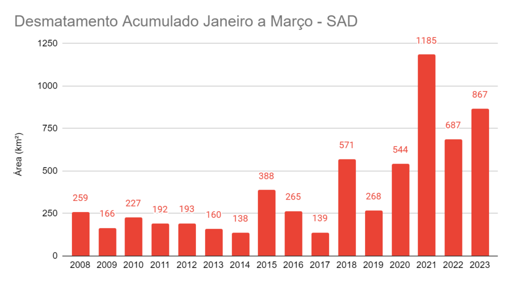 A devastação da floresta amazônica triplicou em março e fez o primeiro trimestre de 2023 fechar com a segunda maior área desmatada em pelo menos 16 anos. Segundo o monitoramento por imagens de satélite do Imazon, implantado em 2008, foram derrubados 867 km² nos três primeiros meses deste ano. Área que equivale a perda de quase mil campos de futebol por dia de mata nativa. Essa destruição só não foi maior do que a registrada em 2021, quando foram postos abaixo 1.185 km² de floresta de janeiro a março.