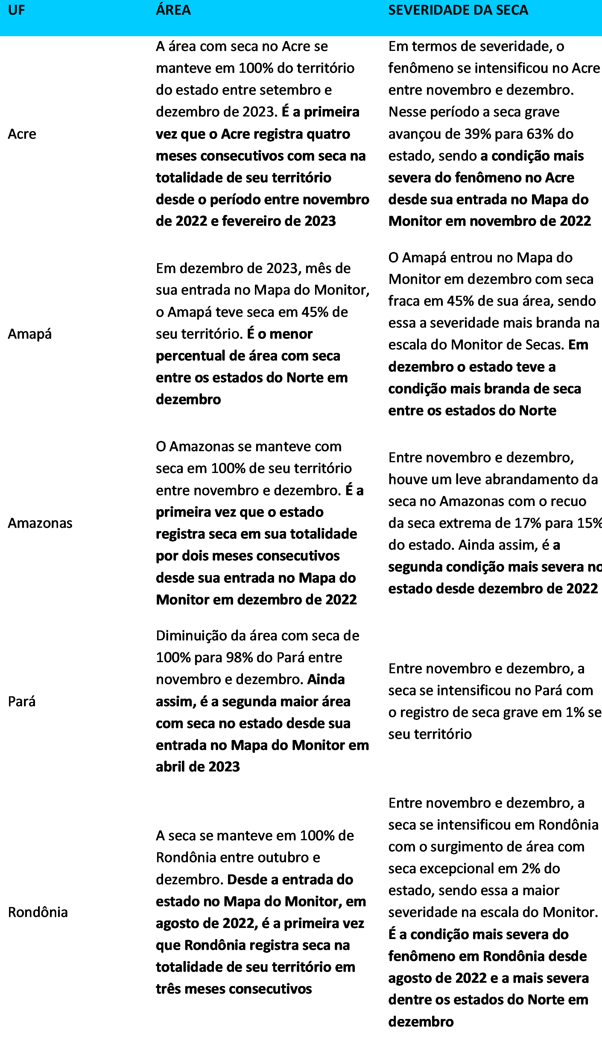 Treze unidades da Federação registraram seca em 100% do território em dezembro do ano passado: Acre, Amazonas, Bahia, Ceará, Distrito Federal, Espírito Santo, Goiás, Piauí, Rondônia, Roraima, Sergipe, Mato Grosso e Tocantins; sendo que para percentuais acima de 99% considera-se a totalidade dos territórios com seca. Nas demais unidades da Federação que registraram área com seca, os percentuais variaram de 20% a 98%.