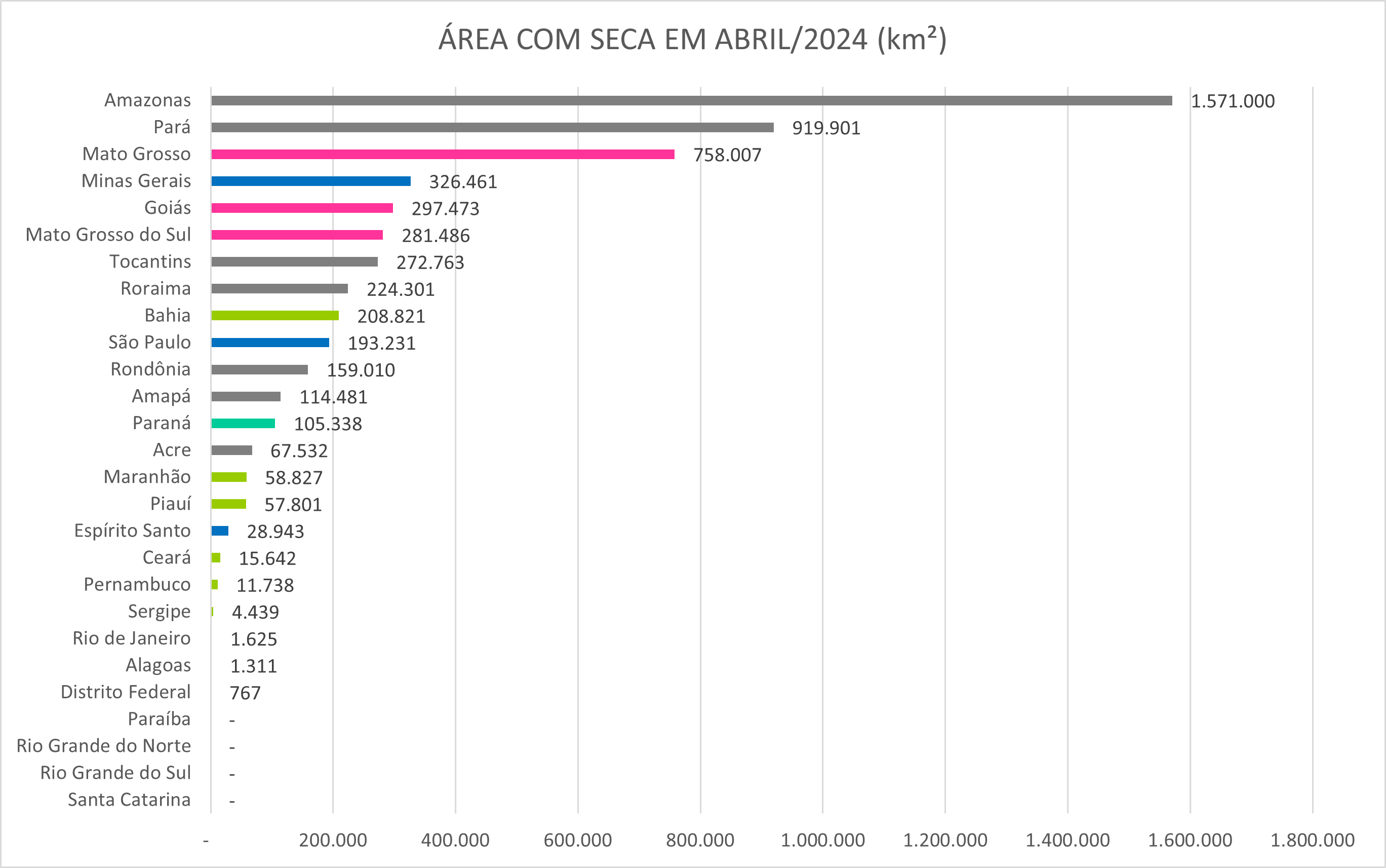 Com base no território de cada unidade da Federação acompanhada, o Amazonas lidera a área total com seca de abril, seguido por Pará, Mato Grosso, Minas Gerais e Goiás. No total, entre março e abril, a área com o fenômeno caiu de 6,41 milhões para 5,68 milhões de km², o equivalente a 67% do território brasileiro.