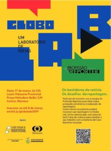 Nos dias 17, 18 e 19 de março, chega à Manaus o Globo Lab Profissão Repórter. Promovido pela TV Globo e em parceria com o Coletivo Difusão, o evento do dia 17 será realizado às 15 horas no Palacete Provincial, localizado no Centro de Manaus. Já nos dias 18 e 19, as atividades serão restritas a outras instituições parceiras. O evento é gratuito e podem participar estudantes de jornalismo vinculados as universidades e instituições parceiras. As inscrições ocorrem até o dia 8 de março.