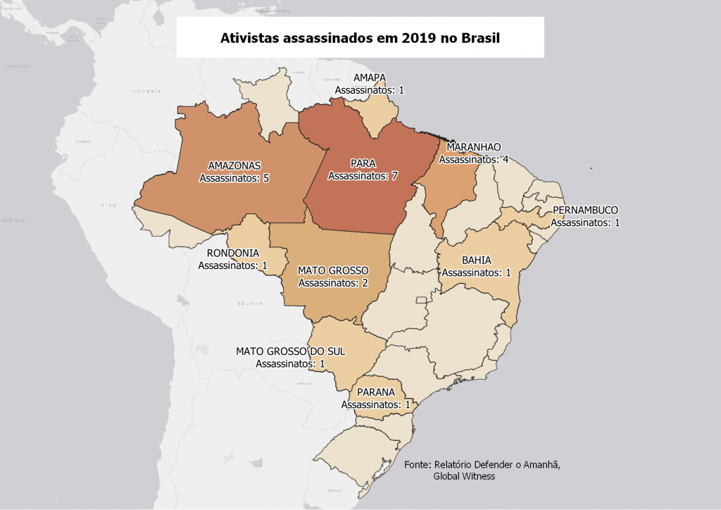 O Brasil é o terceiro país mais letal do mundo para ativistas ambientais, segundo o relatório anual da ONG Global Witness. Em 2019, ao menos 24 pessoas foram assassinadas, quatro a mais do que no ano anterior. O país fica atrás somente da Colômbia, com 64 assassinatos, e das Filipinas com 43.
