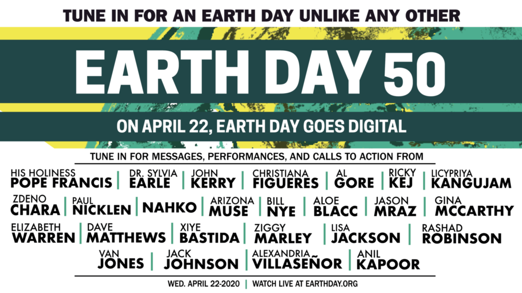 Neste ano, por conta da pandemia de coronavírus, o Dia da Terra será celebrado em um evento virtual. A Earth Day Network, organização que coordena o movimento, anunciou que transmitirá ao longo desta quarta-feira, em seu site oficial, uma série de mensagens gravadas e lives com personalidades como o Papa Francisco, o ex-vice presidente Al Gore, o ator Zac Efron e o ambientalista Denis Heyes, que organizou o primeiro Dia da Terra.