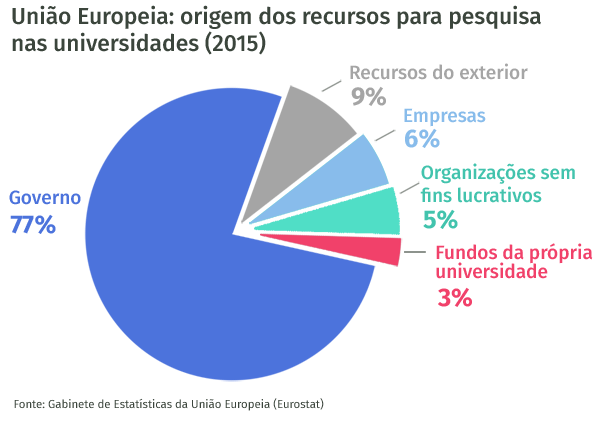 De maneira similar, na Europa o governo também é a principal fonte de recursos das instituições, de acordo com os dados do Gabinete de Estatísticas da União Europeia (Eurostat), correspondendo, em 2015, por 77% da receita total.