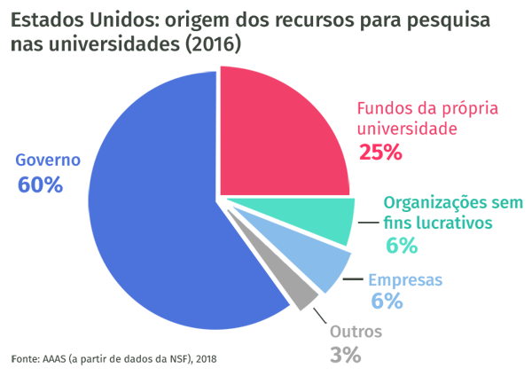 Ao redor do mundo, universidades e outras instituições de pesquisa são financiadas majoritariamente com recursos públicos. Nos Estados Unidos, por exemplo, 60% do dinheiro para a pesquisa vêm dessa fonte, como mostram os dados da ‘National Science Foundation’ (NSF) com a Associação Americana para o Avanço da Ciência (AAAS).