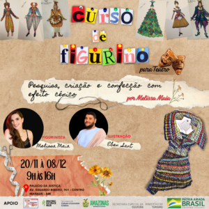 O “Curso de figurino para teatro – pesquisa, criação e confecção de figurinos com efeito cênico”, que pretende repassar conhecimentos teóricos e práticos aos interessados em trabalhar na área, está com inscrições abertas. Ministrado pela figurinista amazonense Melissa Maia, acontecerá de 20 de novembro a 8 de dezembro e será o primeiro a ser realizado em Manaus abrangendo todas as etapas do processo criativo de teoria e prática de figurino. São oferecidas 20 vagas limitadas e as inscrições podem ser realizadas por meio do formulário.