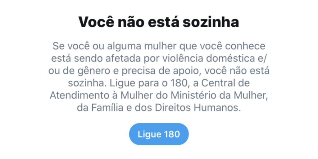 Sempre que alguém escrever na busca do Twitter palavras e termos relacionadas a alguma forma a violência de gênero, o primeiro resultado a ser visualizado é uma notificação indicando que a pessoa pode procurar ajuda. Basta clicar no link do disque-denúncia para ligar para o 180 ou no link para a página do MDH para obter mais informações a respeito do assunto. O recurso pode ser utilizado não apenas pelas vítimas, mas também por testemunhas e outras pessoas que tomem conhecimento ou presenciem casos de violência contra a mulher.