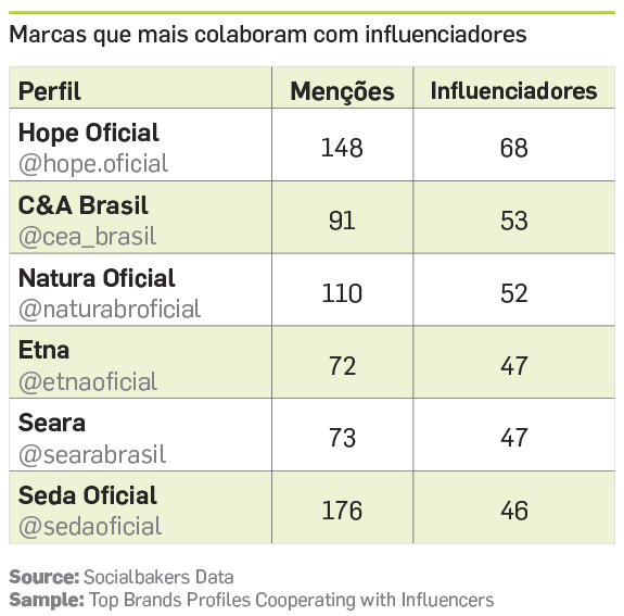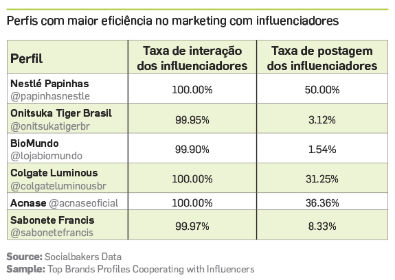 De acordo com um estudo realizado pela Socialbaker, empresa de marketing de mídia social que trabalha com inteligência artificial, apontou que a Hope, C&A e Natura são as marcas que mais trabalharam com influenciadores no Instagram no Brasil no último trimestre. Mas as empresas que tiveram uma taxa maior de interação entre os usuários da plataforma e os influenciadores, foram a Nestlé Papinhas, a Onitsuka Tiger Brasil e a Bio Mundo.