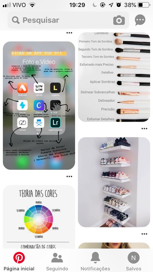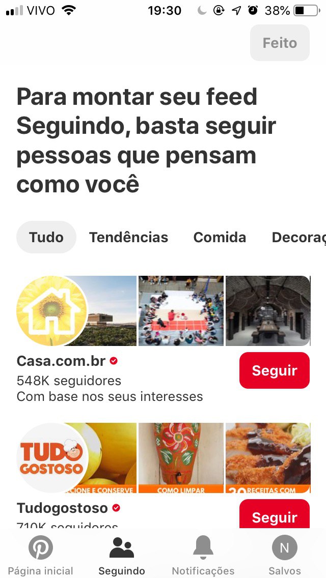 Depois que você já estiver seguindo mais temas ou usuários, é possível fazer uma série de interações com os pins! Na página inicial ou nos boards encontrados, você pode tocar sobre algum dos pins e assim explorar imagens semelhantes.