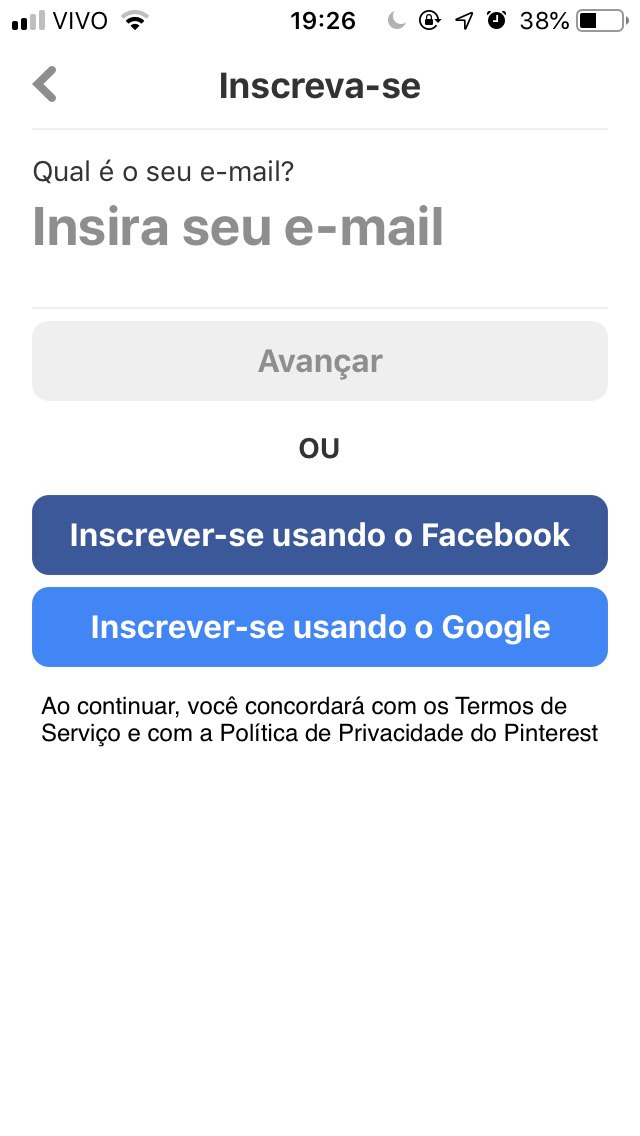 O primeiro passo é criar uma conta para utilizar o Pinterest. Você pode conectar a sua conta do Facebook ou Google ou então criar uma nova conta a partir do seu endereço de email.