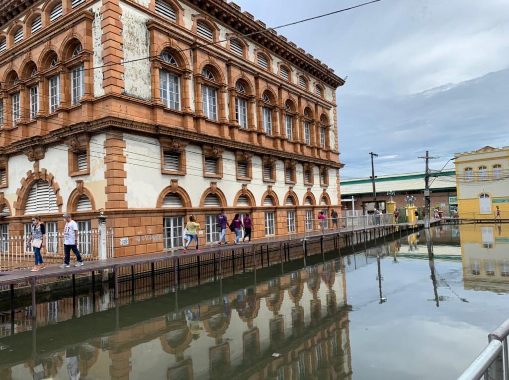 Histórico prédio da Alfândega, no Centro de Manaus, se transformou com a cheia (Foto: Marcella Botelho)