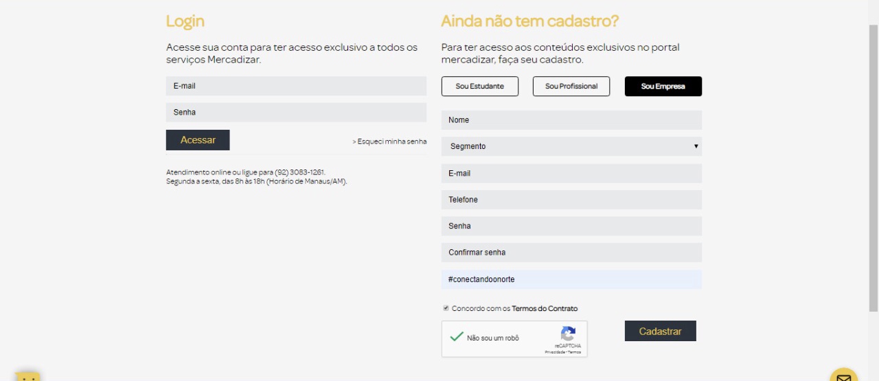 2º Passo: Em seguida preencha o formulário com o nome da empresa, segmento do qual ela faz parte, e-mail e telefone para contato e insira uma senha de acesso de sua preferência. No campo seguinte, coloque o cupom #conectandoonorte para ganhar uma anuidade grátis. Selecione as opções “Concordo com os Termos do Contrato” e “Não sou um robô”. Agora pode clicar em “Cadastrar”.