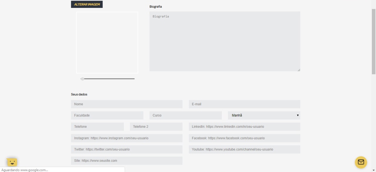 3º Passo: Uma nova aba irá abrir e esse é o momento de inserir uma imagem de perfil e uma biografia (Capriche!). Além disso, não esqueça de colocar os links das suas redes sociais, assinalar se possui experiência ou não e, principalmente, dizer quais são as suas habilidades, formação e fazer o upload do currículo. Em seguida, clique em “Atualizar dados” e seu cadastro está pronto.