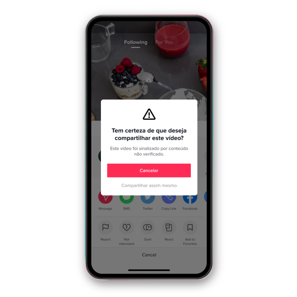 O TikTok anunciou que começará a exibir alertas em vídeos que contenham informações questionáveis ou que não possam ser confirmadas por agências de verificação de fatos. A partir de agora, o aplicativo exibirá uma mensagem de alerta com os dizeres “Cuidado: vídeo sinalizado por conteúdo não verificado”, o que significa que algum checador de fatos pode ter investigado, mas não conseguido confirmar a veracidade das informações contidas no vídeo. Caso a informação falsa seja confirmada, o vídeo será retirado.